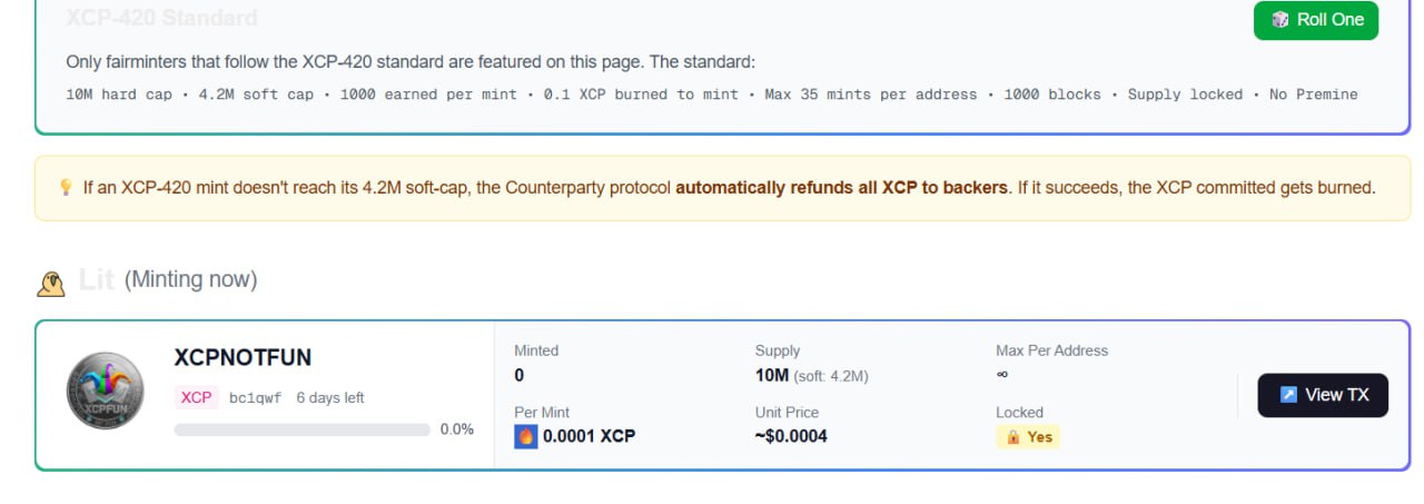 Dan Anderson (@droplister)I'm proposing the XCP-420 Standard for Fairmints • 10M supply • 4.2M soft cap • 0.1 XCP burned per mint • 35 mints max/address Fairminter refunds XCP if it fails to "bond". Burns XCP if it succeeds. All enforced at protocol level. 🔥 The homepage of XCP[.]FUN is setup to feature them. Quoting Dan Anderson (@droplister) Vibe coded a big board for Counterparty fairmints (WIP)