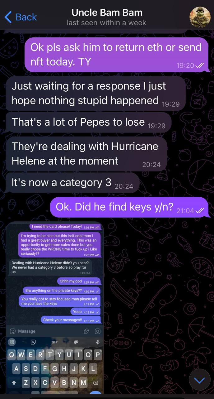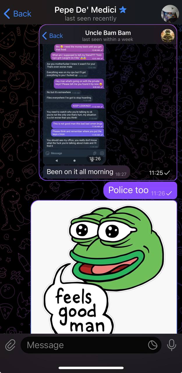 Uncle Bam Bam scammed me; his friend had a rarepepe I wanted to buy and he 'brokered' the deal. I send him 1 ETH (stupid I know) and first there was a problem with friends computer and then a hurricane (I checked the ETH and it moved) and of course I did not receive nft. Since ETH is traceable to cex file police rapport. It is really sad and I would not be surprised if Uncle scam bam is here under other name again. Friendly Reminder: No OTC deals and beware of scammers.
