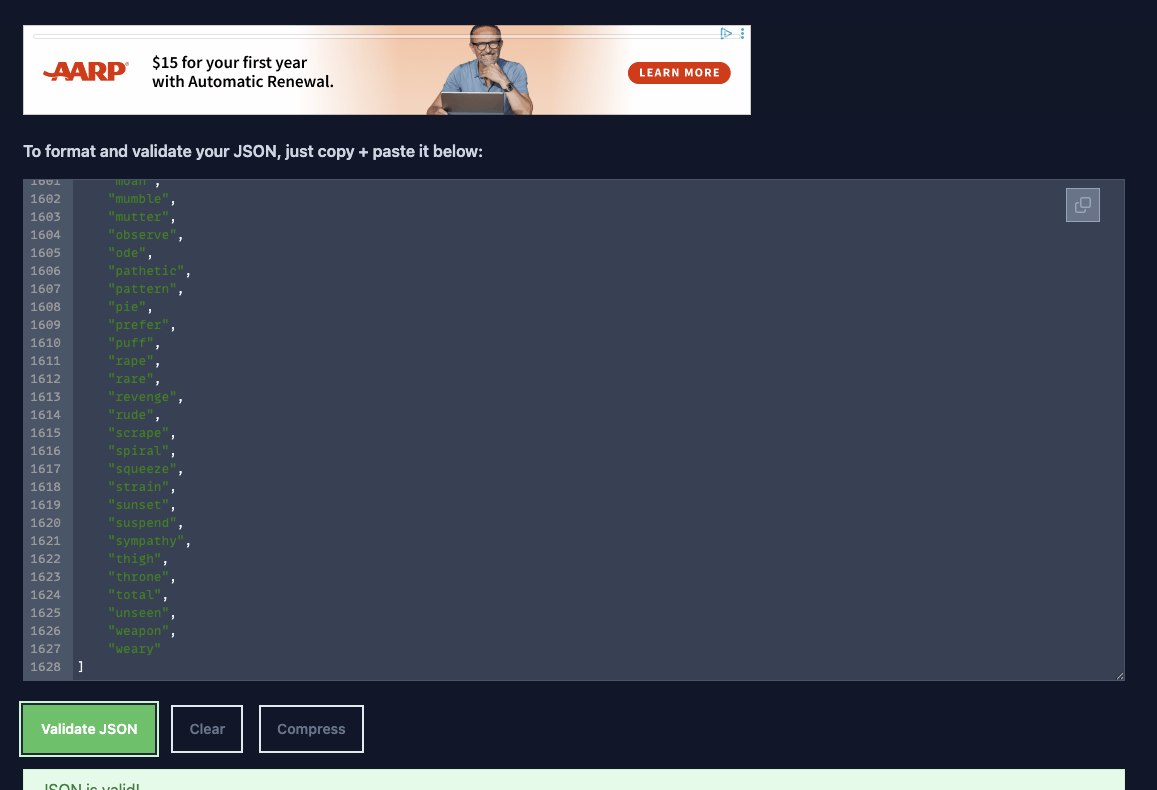 chatGPT lies... I copied the wordlist from the library and pasted it into jsonlint and validated... 1626 words just like the library indicatres... how he picked those words, dunno... but def 1626 words -