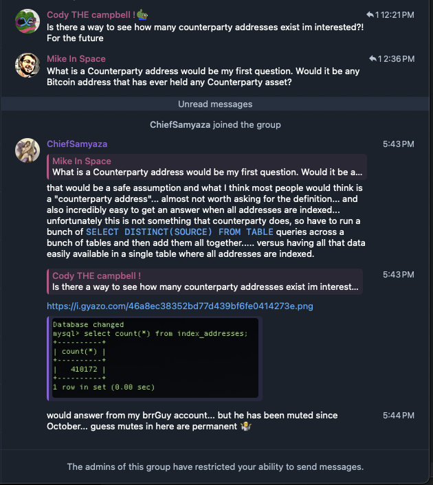 What is a Counterparty address would be my first question. Would it be any Bitcoin address that has ever held any Counterparty asset? - 18 June 2025 (8 messages)