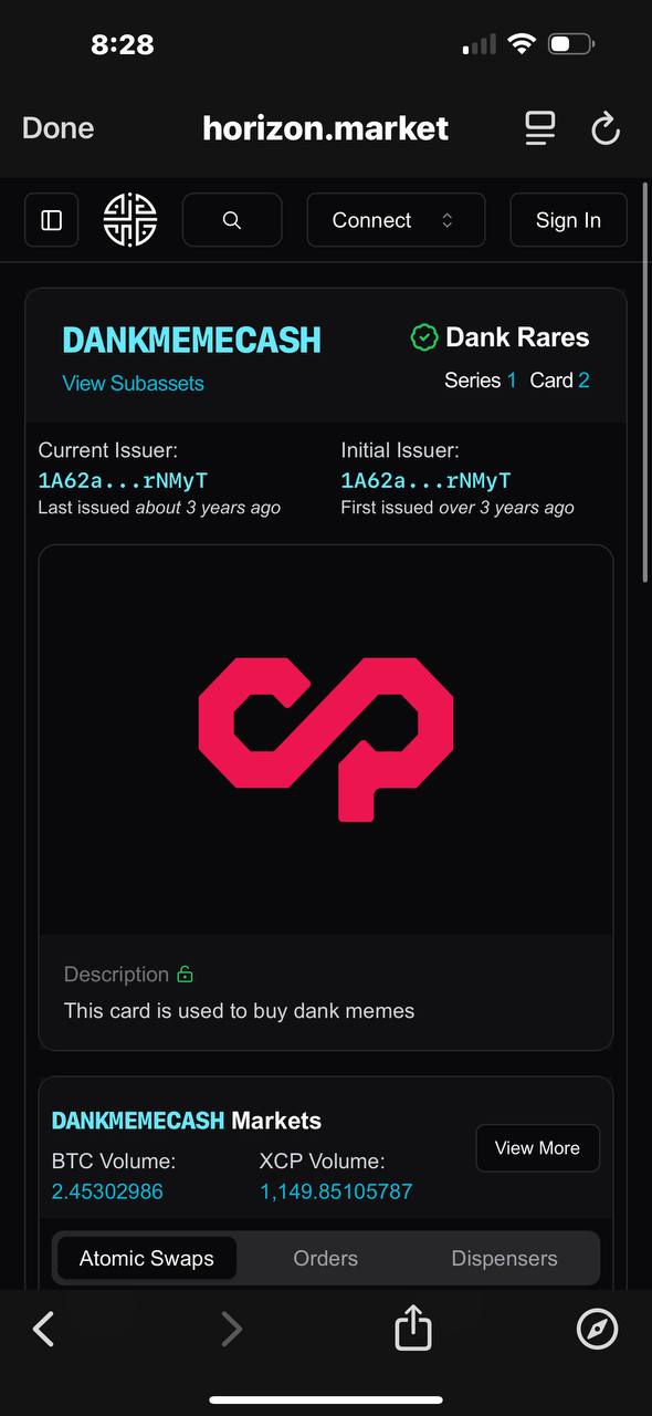 Also think for each collection, like here: https://horizon.market/explorer/discover/rare-pepes, you should be able to see card prices and supply. Most old collections seem to be missing from "Discover" despite them accounting for majority of value on the protocol.Horizon Market | Trade Bitcoin NFTs & Counterparty TokensHorizon Market is the home for Bitcoin NFTs like Rare Pepes and Spells of Genesis. Trade Counterparty assets with trustless, one-confirmation swaps.