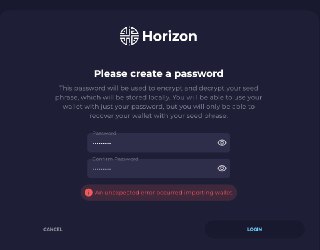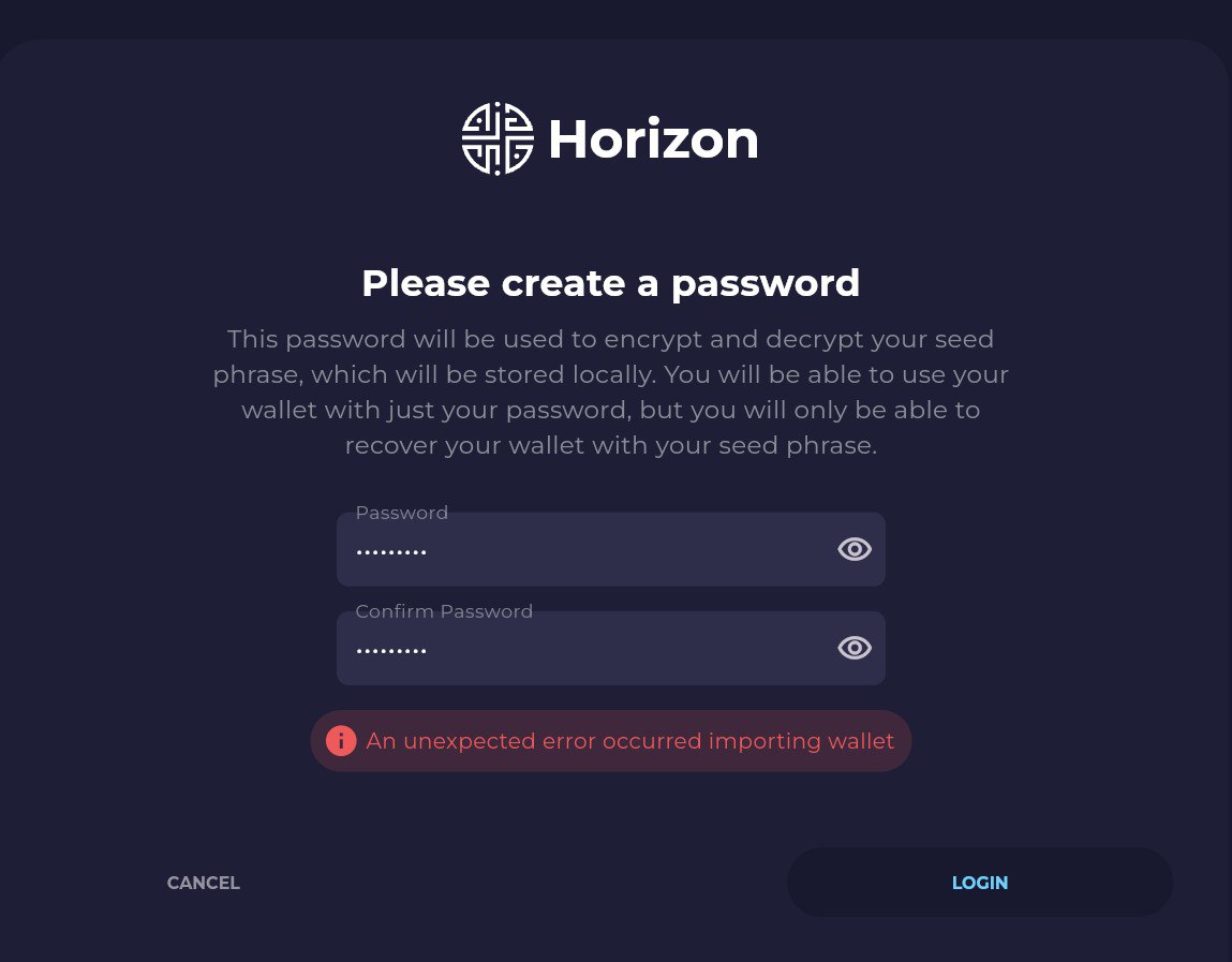 I think it’s the seed phrase type, if I use a native horizon, it works great -