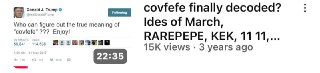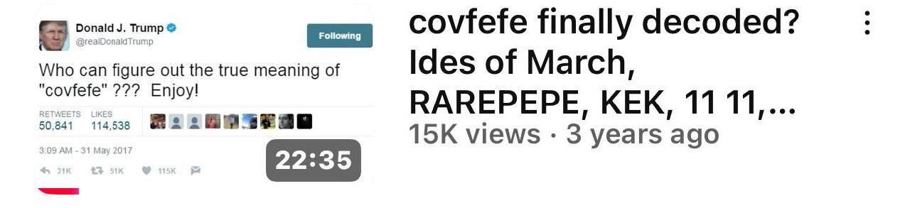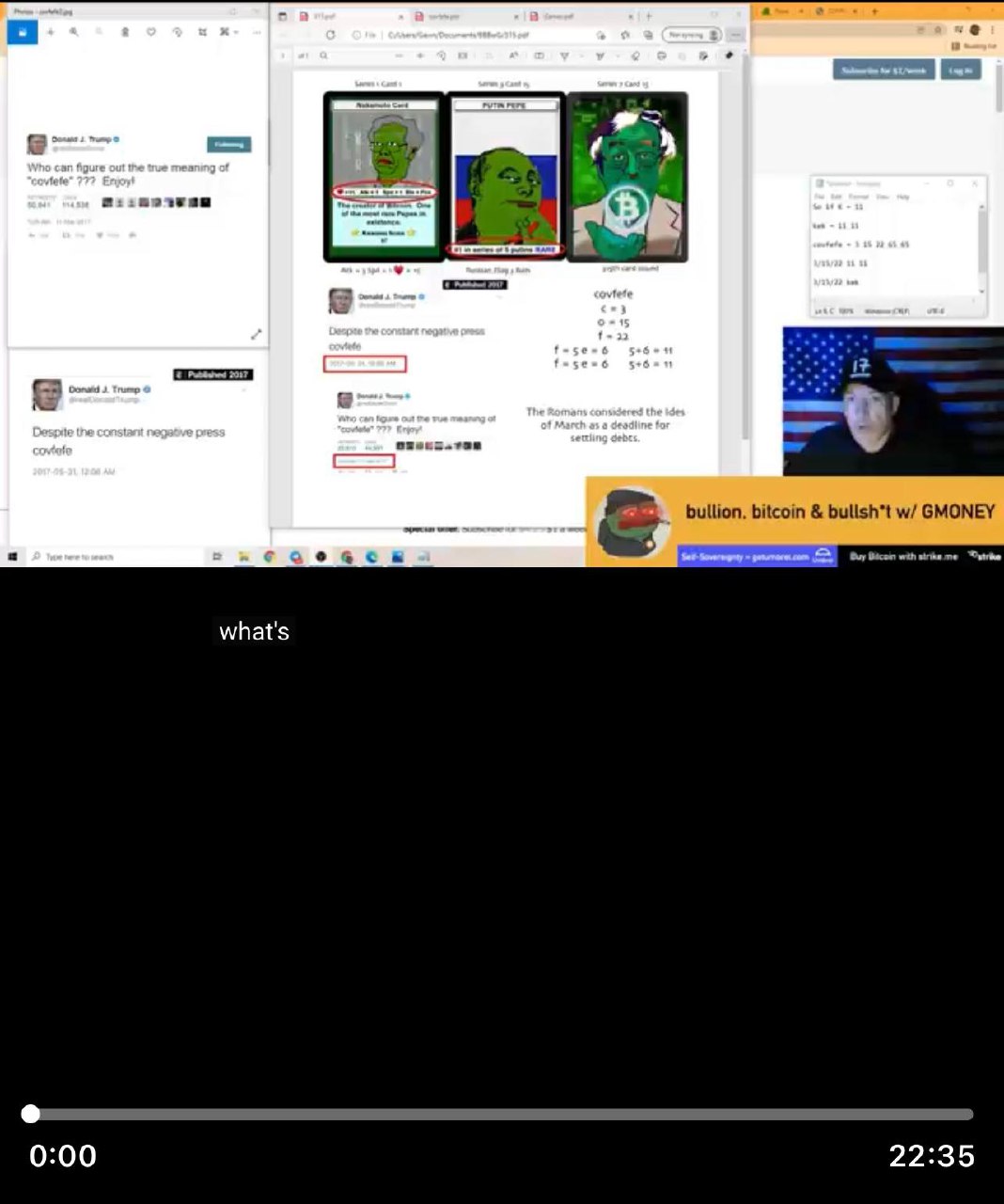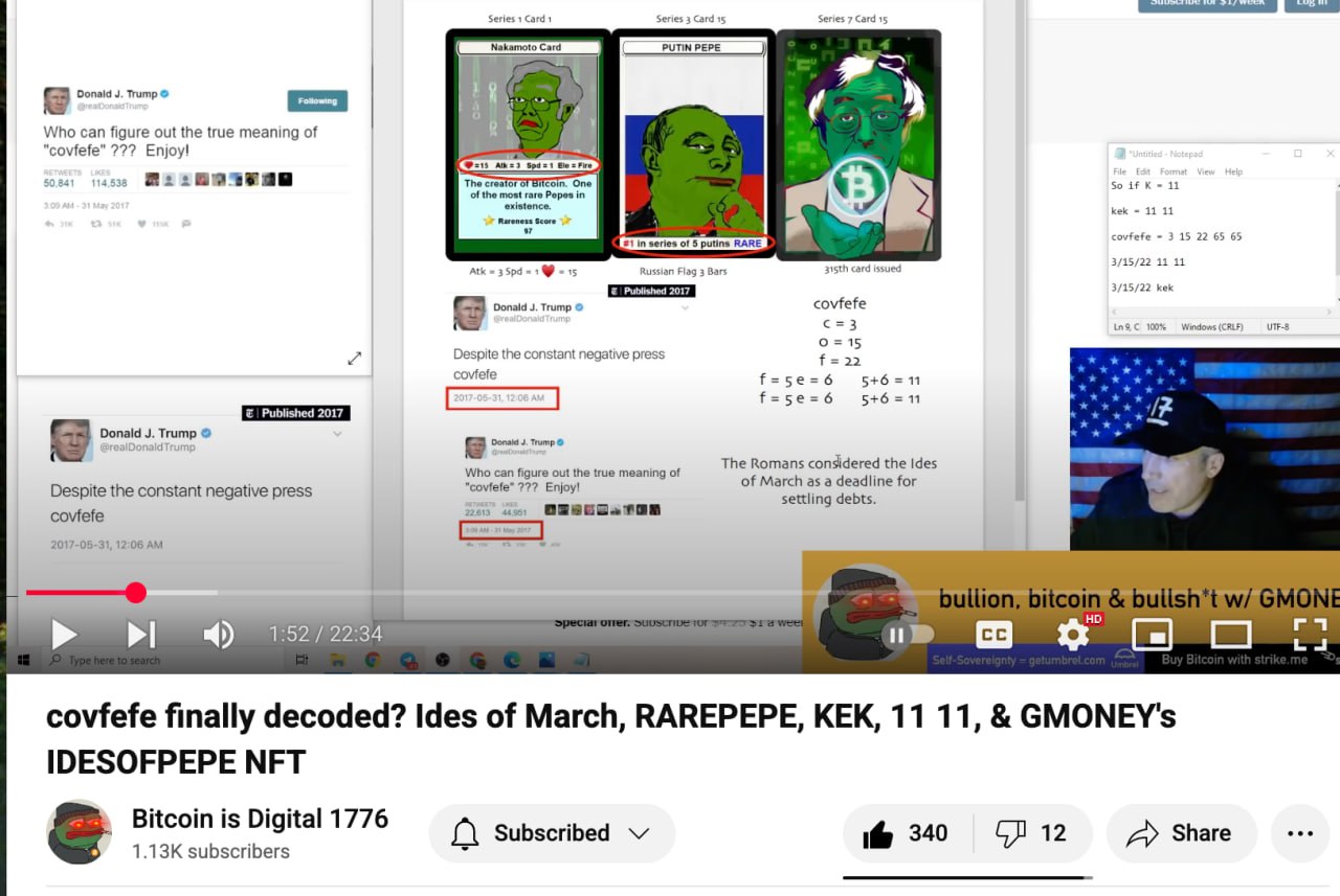 covfefe finally decoded? Ides of March, RAREPEPE, KEK, 11 11, & GMONEY's IDESOFPEPE NFTHave we finally decoded covfefe? 3/15/22 kek 315th day of the year is also 11/11 Checkout my tokenized research NFT's! The PEPE Project - http://www.pepeproject.com Get Strike FREE $5 in Bitcoin - https://invite.strike.me/6FP1Y4 Join the discussion on telegram - https://t.me/bullionbitcoinbs https://www.nytimes.com/2017/05/31/us/politics/covfefe-trump-twitter.html https://www.bbc.com/news/world-us-canada-39843468 https://www.theverge.com/2016/9/15/12926976/hillary-clinton-trump-pepe-the-frog-alt-right-explainer https://www.youtube.com/watch?v=Se6PrO_PrMA https://www.splcenter.org/hatewatch/2017/05/08/what-kek-explaining-alt-right-deity-behind-their-meme-magic https://en.wikipedia.org/wiki/World_of_Warcraft https://www.boxentriq.com/code-breaking/letters-to-numbers http://rarepepedirectory.com/?p=10 https://pepe.wtf/catalogue https://pepe.wtf/asset/PUTINPEPE http://rarepepedirectory.com/?p=2737 http://rarepepedirectory.com/?p=4127