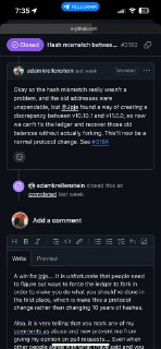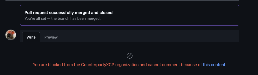 And now Im lectured on what 's not okay. Too bad i can't reply. I'd be happy to remind him that booting the people that invited you to Github is not okay, cancelling the CIP process is not okay, forcing changes without community support is not okay, reversing balance history is not okay, non backward changes to cntrprty messages are not ok .. -