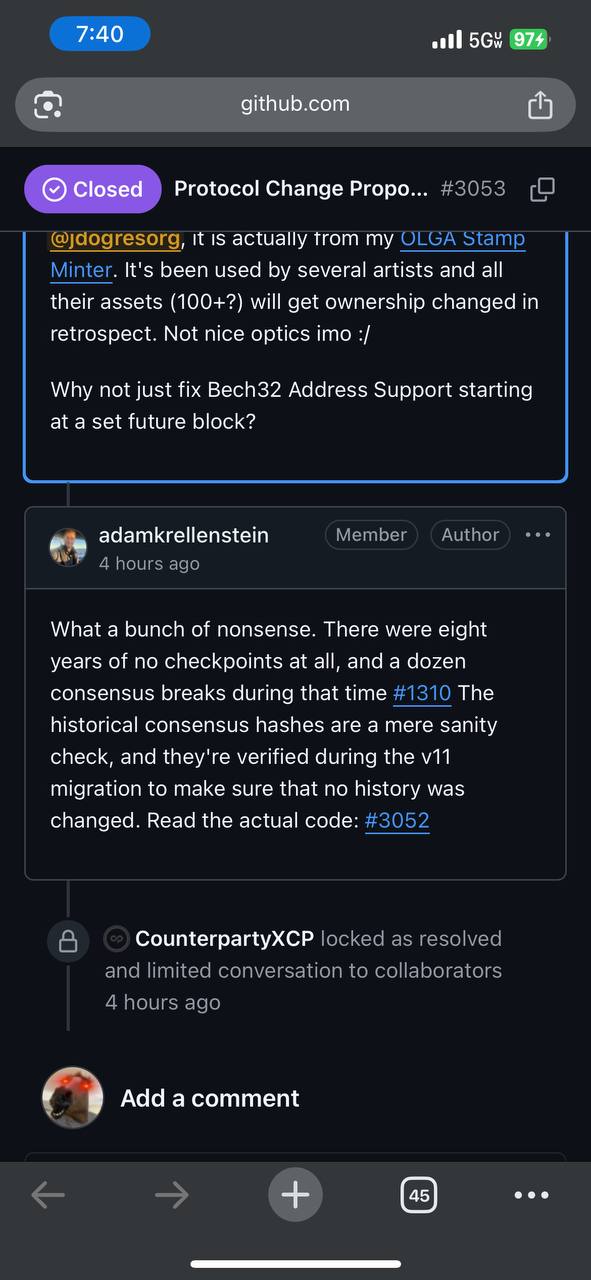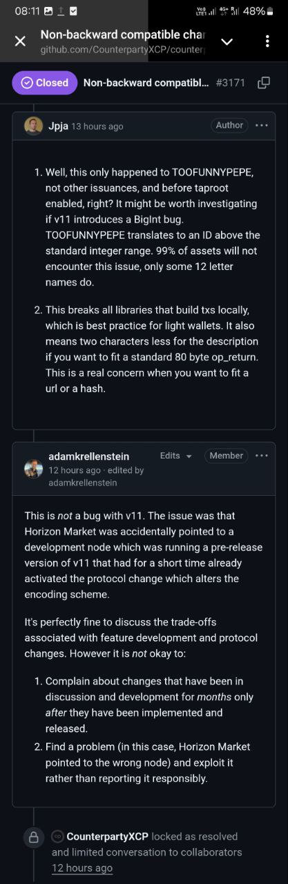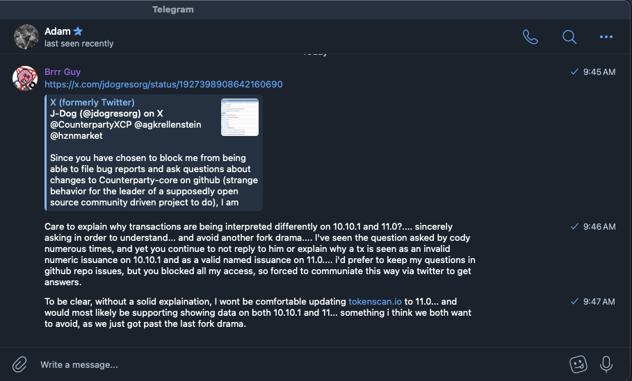 https://x.com/jdogresorg/status/1928159685481484490J-Dog (@jdogresorg) on XAnother case of a long-time Counterparty member raising valid concerns about how changes are being forced into the protocol (changing format rather than issuing a new message type id, which is what has been done each time the issuance format has changed over the past 10 years. I