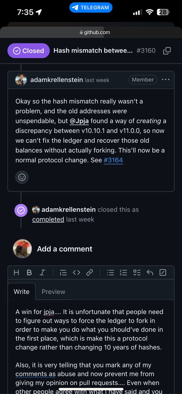 pretty hilarious that the problem with TOOFUNNYPEPE was that the core devs were using v11.0 in production without letting users know to generate txs.... 10.10.1 parsed the tx that 11 generated in a funky way since it had additional bytes in it (the new issuance format).... and Adam explanation as to how it happened was that "someone was using a pre-release version of v11".... since we know it was Cody that did the tx, and we know that cody is not running his own v11 node.... it indicates that indeed Adam and team were running v11 in production before release... ie, letting the community test their software before release. -